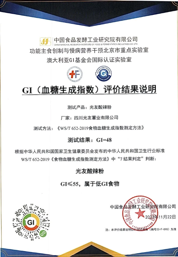 4月23日訊:近日,光友薯業(yè)收到來自中國食品發(fā)酵工業(yè)研究院GI營養(yǎng)工作室的喜訊,光友薯業(yè)生產(chǎn)的明星產(chǎn)品——光友酸辣粉成功通過中國食品發(fā)酵工業(yè)研究院GI國際聯(lián)合研究與測試實驗室標(biāo)準化GI測試流程,被認證為低GI食物。