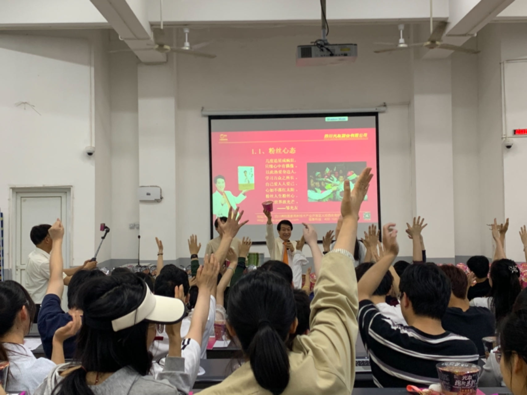 大家都踴躍地加入到活動(dòng)當(dāng)中,一個(gè)個(gè)同學(xué)接連勇敢走上舞臺(tái),與光友薯業(yè)董事長(zhǎng)鄒光友熱情交流互動(dòng)。許多學(xué)子登臺(tái)共跳光友粉絲舞,現(xiàn)場(chǎng)氣氛徹底點(diǎn)燃。