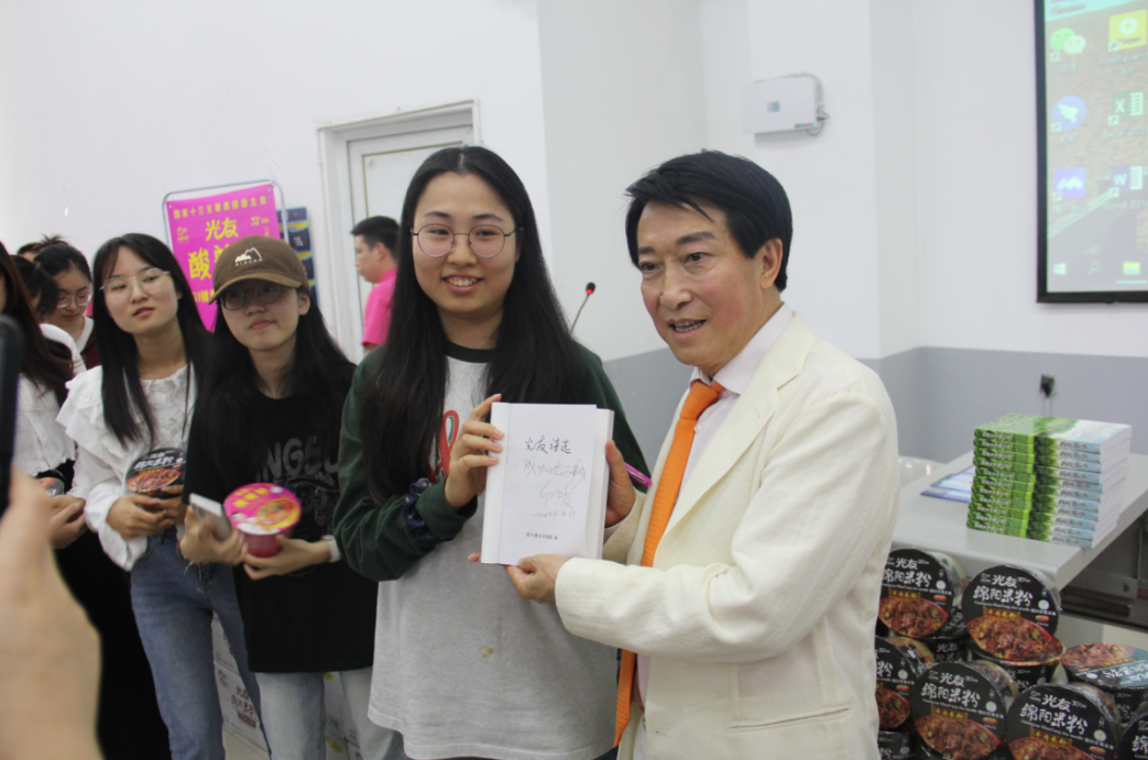 演講后,鄒光友董事長(zhǎng)贈(zèng)送學(xué)子現(xiàn)場(chǎng)簽名的《光友詩(shī)選》并合影留念。