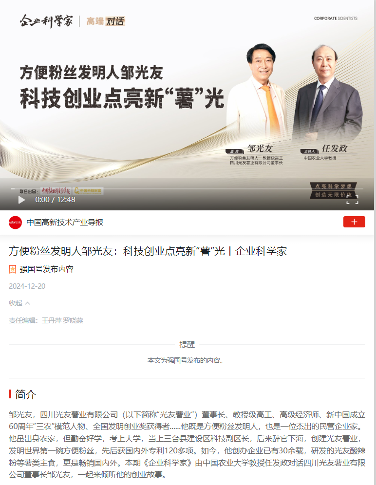 轉(zhuǎn)載學習強國中國高新技術(shù)產(chǎn)業(yè)導報——方便粉絲發(fā)明人鄒光友:科技創(chuàng)業(yè)點亮新“薯”光丨企業(yè)科學家